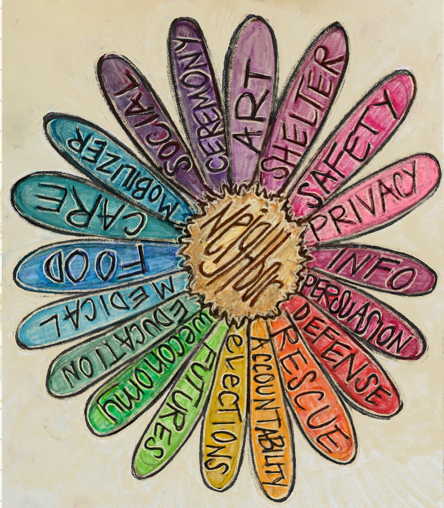 But, first and foremost, I recommend you read, play with, implement, and practice “The Daisy Chain: A Neighbor’s Guide to Mass-Cooperation” in your own neighborhood— because without parallel systems of support, we will fall. While I might’ve written The Daisy Chain, it is not proprietary information. The Daisy Chain is simply a synthesis of what decent people have always done when their backs are against the wall and institutions are weaponized against them. It is our common story— mass-cooperation is in our DNA. It’s how we’ve survived this long: adaptation and cooperation.